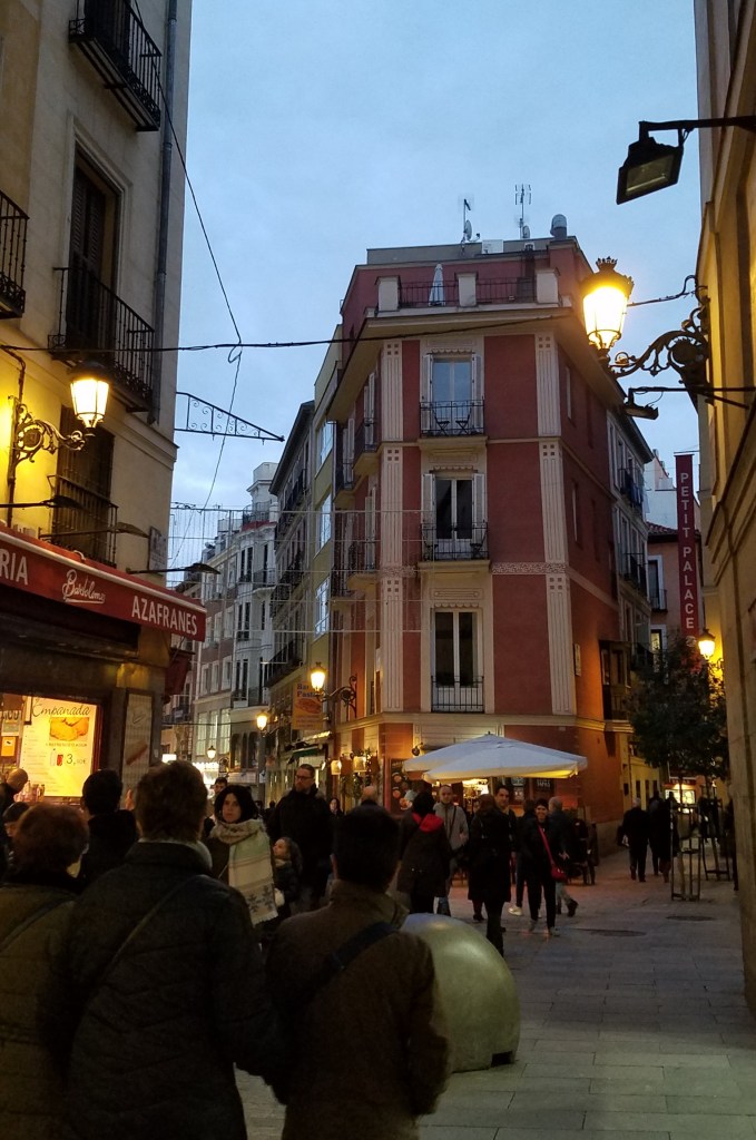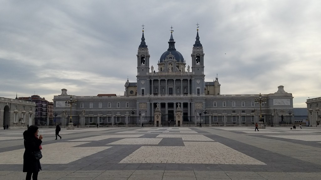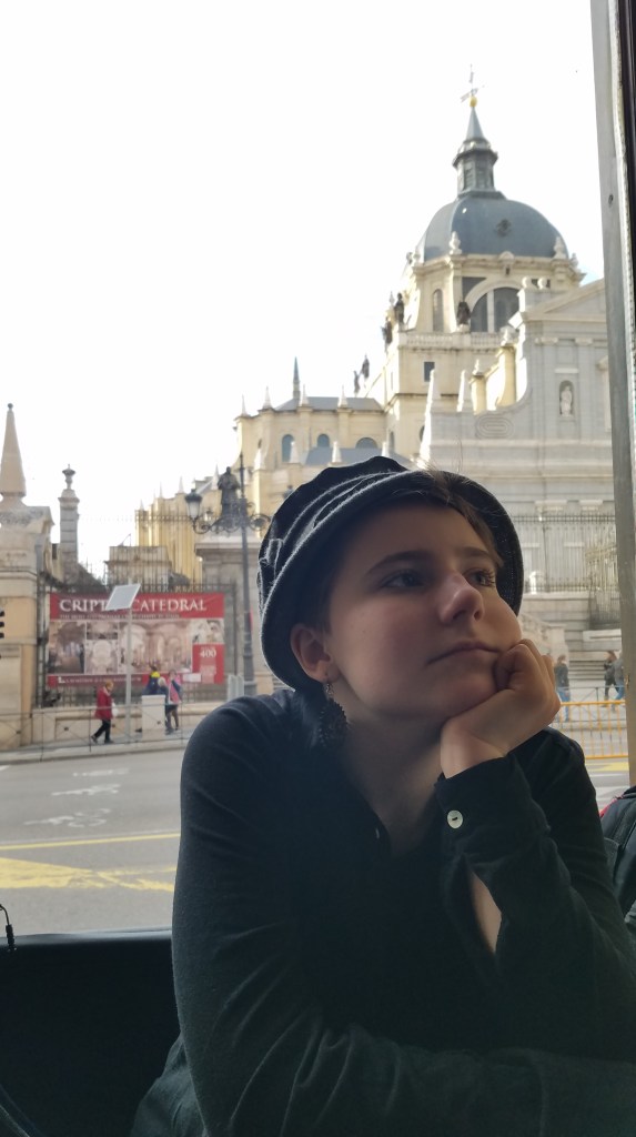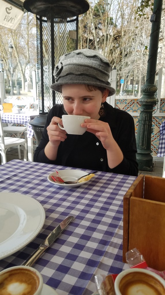 We arrived in Madrid around 9AM local time, which was about 3AM Michigan time. We were a little tired, but ready to start the adventure. Our first stop was, of course, coffee and Spanish hot chocolate at La Lonja del Mar. My first cortado was divine, and my Tiny Grown Up was thrilled by what appears to be a hot cup of chocolate pudding with our first ever churros. We also shared a goat cheese salad. Everything was delicious, and even being right in the midst of the tourist district, the prices were very reasonable by American standards. We sat on the patio and watched the magpies and parrots in the Plaza de Oriente.
