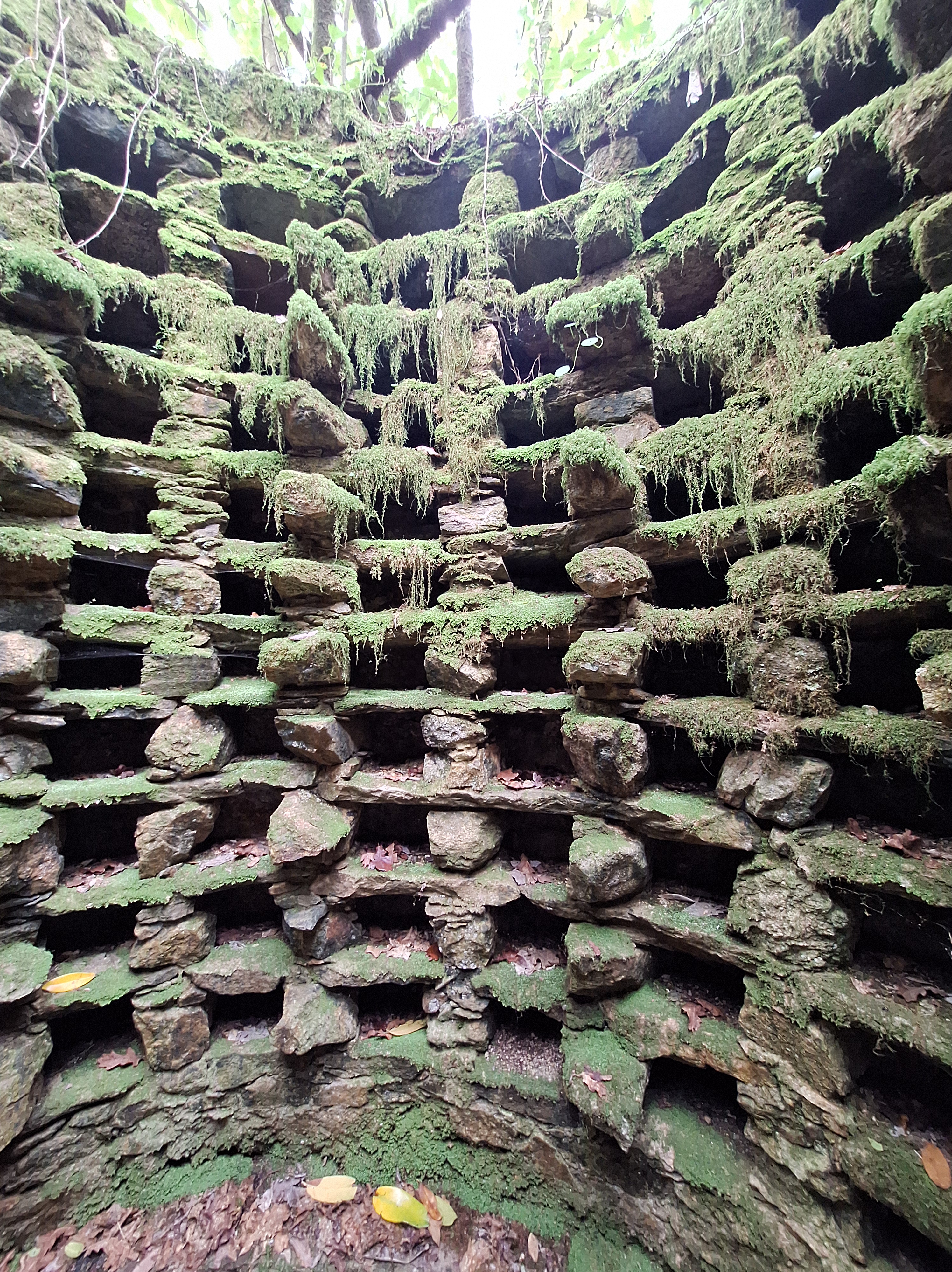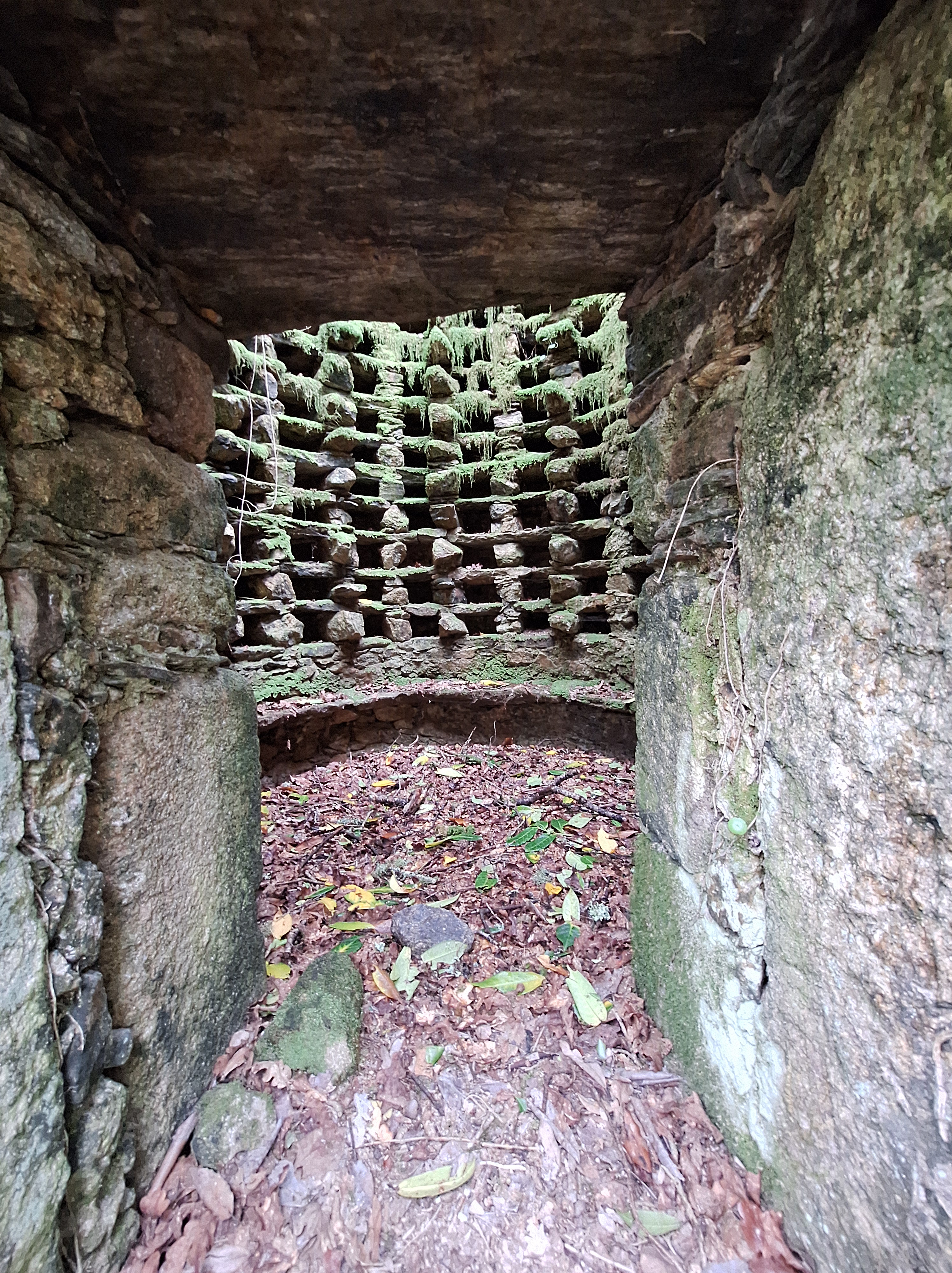 While there are several near identical cupboards in the walls, this one is just ever so slightly different. There small opening in the stone panel that forms the outer wall. On the outside, there is a flat stone just below the hole that is likely a little bee landing pad where they could stop before entering their private door.